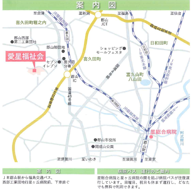 【交通のご案内】 ●JR郡山駅より車で約20分 ●JR磐越西線・喜久田駅より車で約8分 ●東北高速道路・郡山インターチェンジより車で約6分