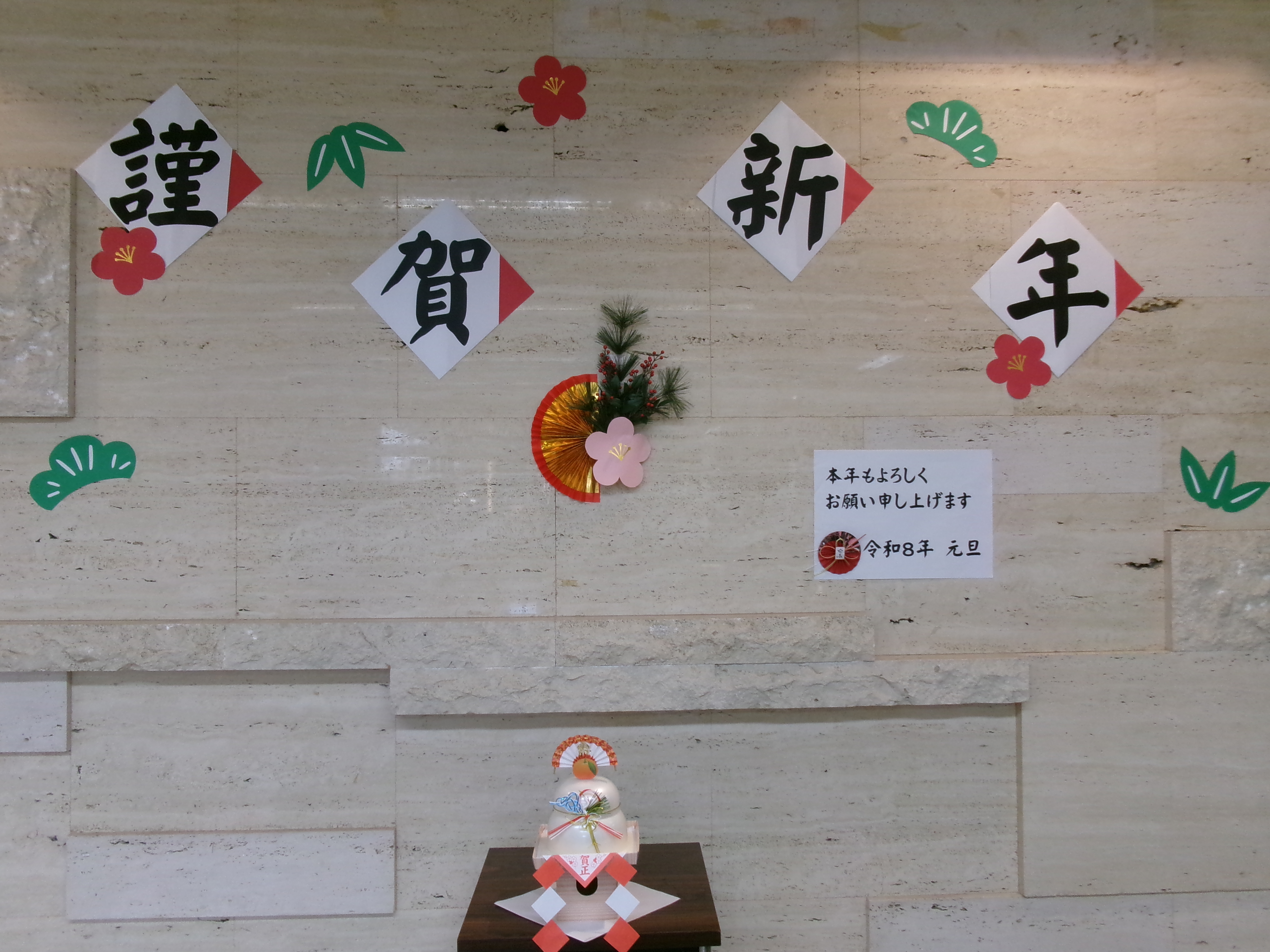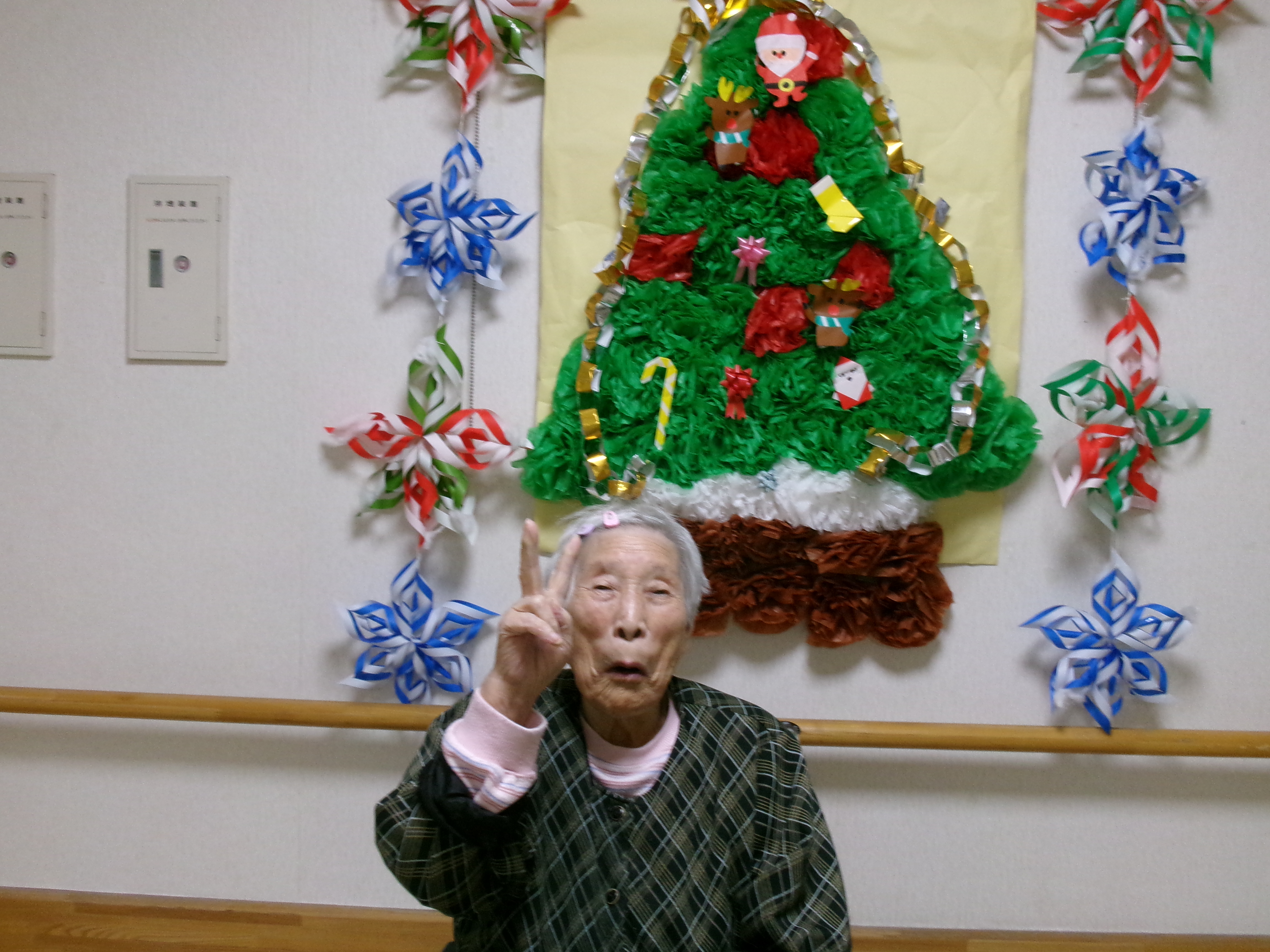 手作り飾りの前で記念撮影