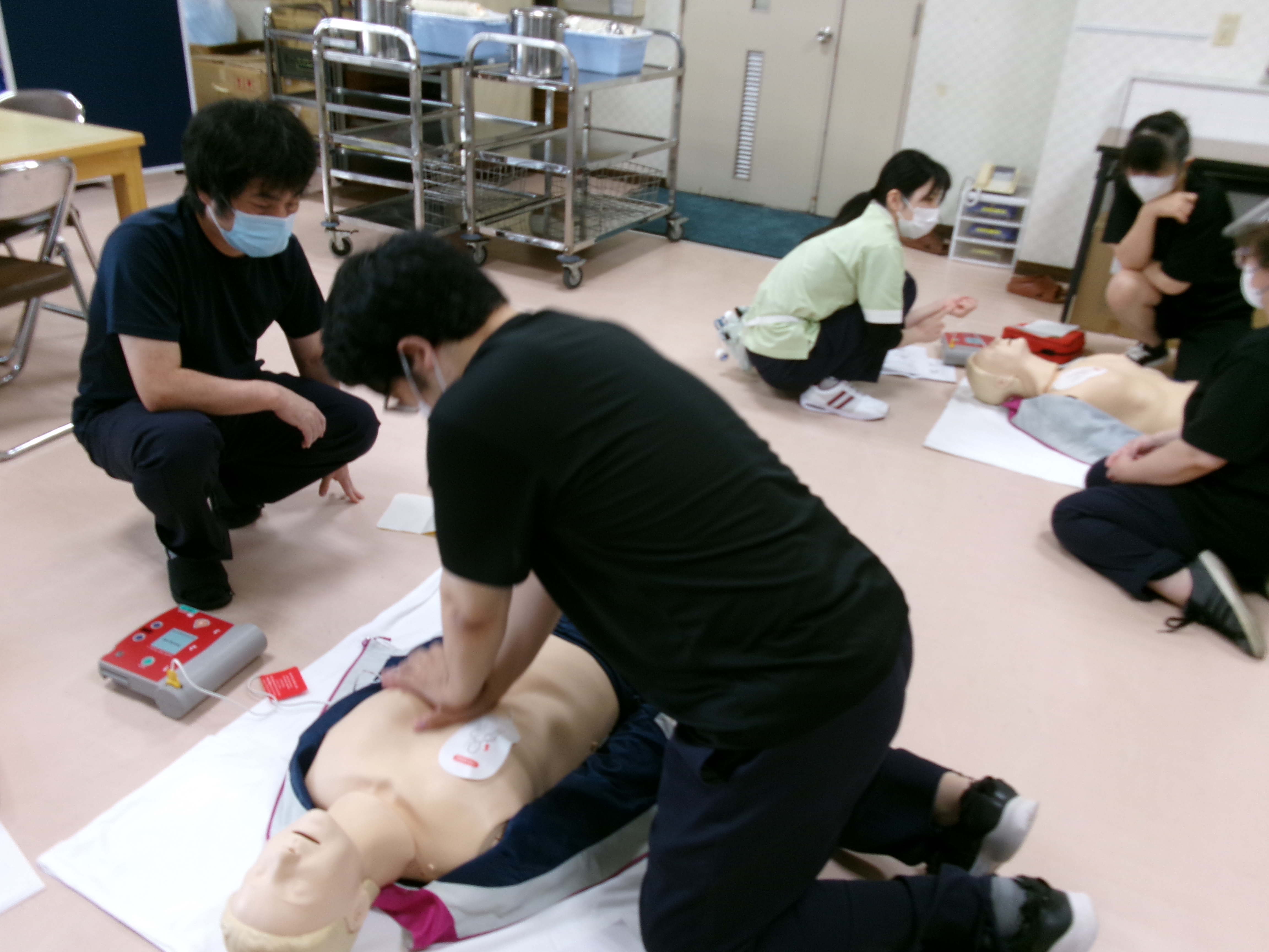 窒息や心肺蘇生等の対応をAEDやトレーニングキットを用いて、協力医療機関と研修会を合同で開催し、利用者さんの安全確保を行っています。